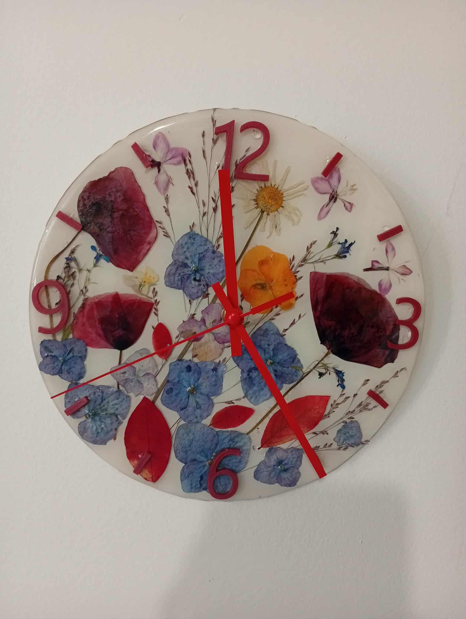 Ručně tvořený ciferník z pryskyřice ukrývá opravdové květy – modré hortenzie, vlčí máky i kopretinu, které spolu s červenými číslicemi tvoří harmonii přírody a elegance.
