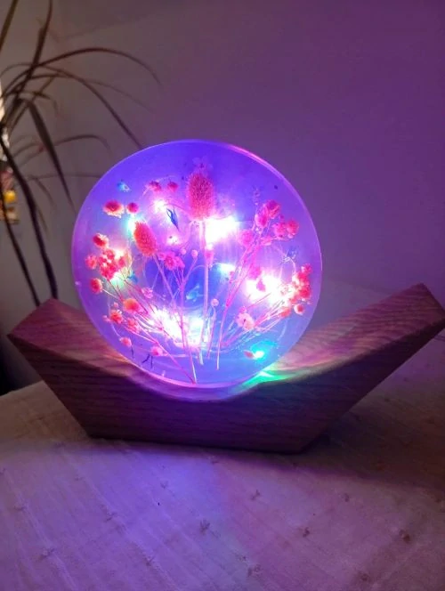 Jemná, nežná dekorační stolní lampa vyrobená z modrofialové pryskyřice , ve které jsou zality růžové květy z mé mlýnské zahrady, plující na loďce z dubového dřeva. Osvětlení LED světelným drátkem na 2 tužkové baterie dodají lampě kouzlo útulného domova v srdci přírody. Led světla dávají záruku, že Vám alkalické baterie v lampě vydrží dlouho, jelikož je spotřeba minimální a přesto je stvítivost skvělá.