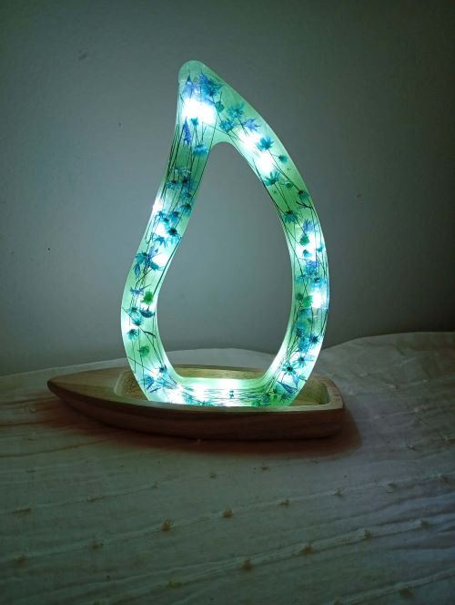 Přírodní květinová lampa vyrobená z křišťálové pryskyřice se zalitými modrými kvítky v mentolové pryskyřici. Lampa dodá Vašemu domovu tajemství a útulnou atmosféru. Osvětlení LED světelným drátkem na 2 tužkové baterie dodají lampě kouzlo útulného domova v srdci přírody. Led světla dávají záruku, že Vám alkalické baterie v lampě vydrží dlouho, jelikož je spotřeba minimální a přesto je stvítivost skvělá.