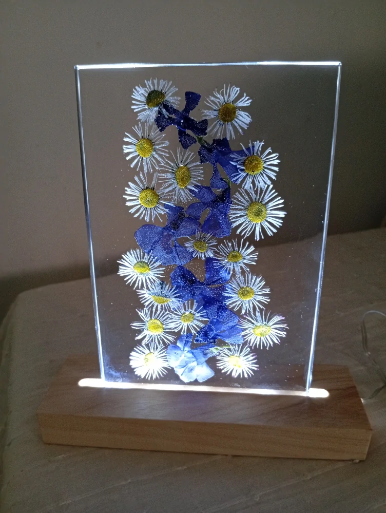 V tiché hloubce čiré pryskyřice se vznášejí něžné modré květy barvínku a sedmikrásky , jako vzpomínka na jarní dny. Jemné světlo ukryté v dřevěném podstavci je večer probouzí k životu.