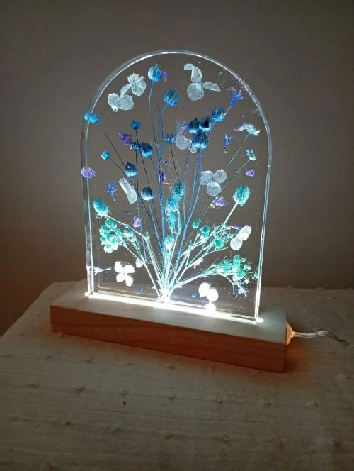 „Elegantní dekorativní lampa s květinovým motivem uzavřeným v čiré pryskyřici vytváří jemnou a uklidňující atmosféru v každém interiéru. Díky teplému LED podsvícení krásně zvýrazňuje detaily květů a stává se stylovým doplňkem do obývacího pokoje, ložnice i pracovny. Ideální také jako originální dárek, který potěší každého milovníka designu a přírody.