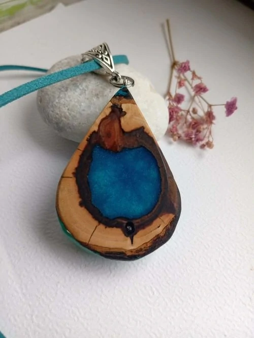 Náhrdelník je vytvořen z krásného švestkového dřeva ve tvaru kapky, kombinován s metalicky modrou pryskyřicí .