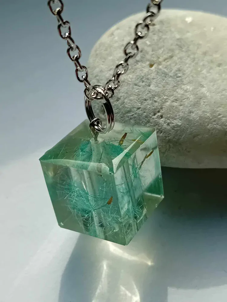 Kostička křišťálově čiré pryskyřice se zalitým pampeliškovým chmýřím.
