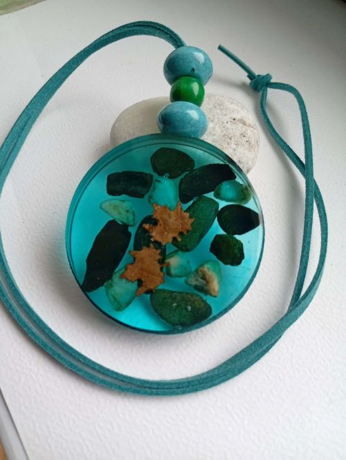 Náhrdelník je vytvořen z pryskyřice ve tvaru vody, se zalitými kamínky a listy.