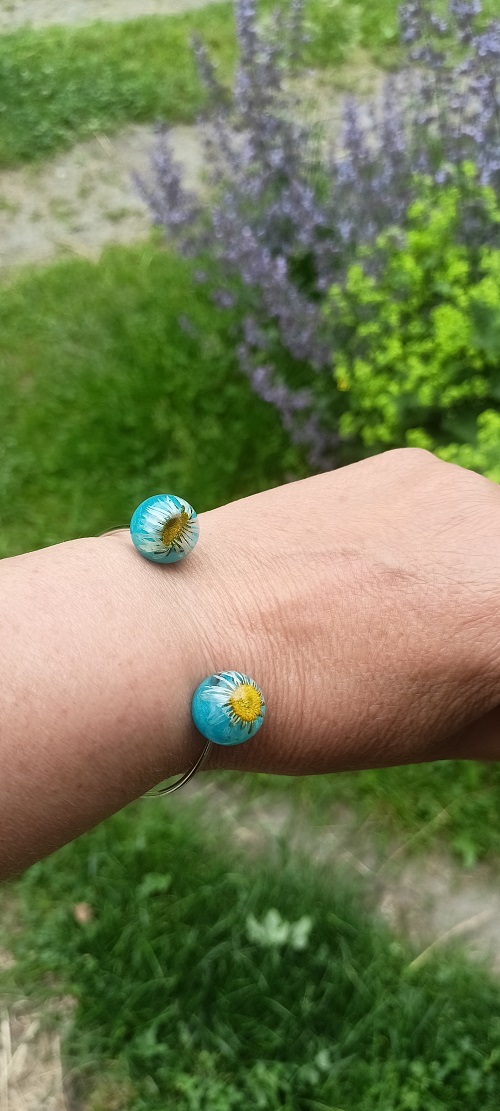 Náramek z nerezové oceli se dvěma kuličkami z křišťálové pryskyřice se sedmikráskami . UNI velikost.