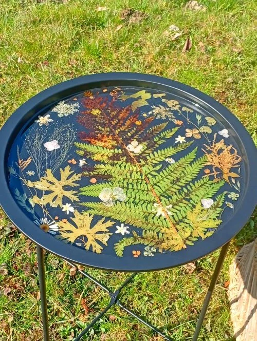 Tento jedinečný stolek propojuje chladnou eleganci kovu s živou krásou rostlin, které byly navždy uchovány v průzračné pryskyřici. Každý lístek, každý detail kapradiny i drobných květů vypráví svůj vlastní příběh – o tichu lesa, o slunečních paprscích dopadajících na zem, o křehkosti okamžiku, který už nikdy nebude stejný.