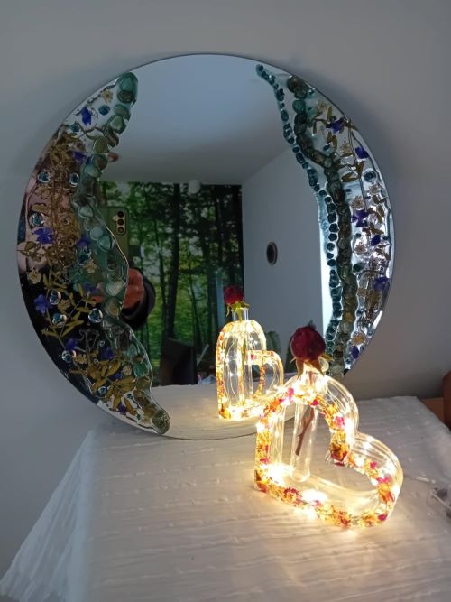 velké kulaté zrcadlo o průměru 38 cm jsem kombinovala s pravými květy a křišťálovou pryskyřicí v modrých a zelených tónech.
